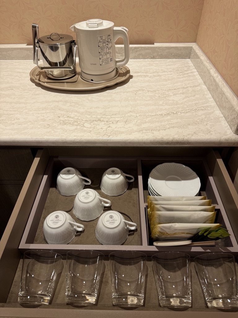 この下の引き出しを開けると無料のお湯で溶かすタイプのお茶とコーヒーとコップがあり、