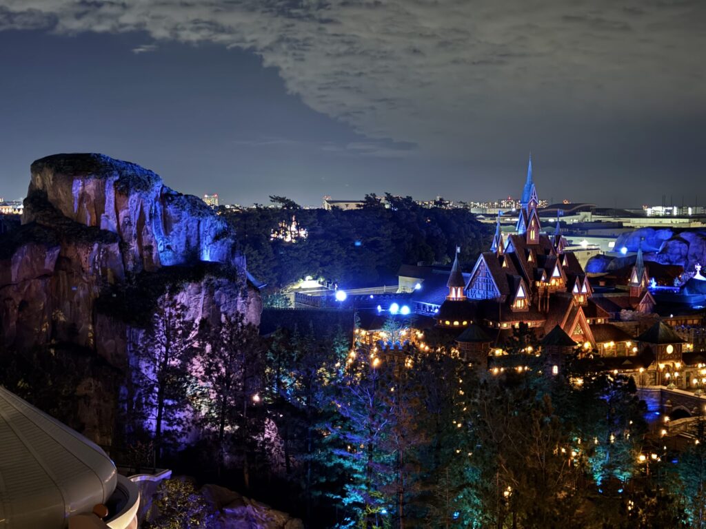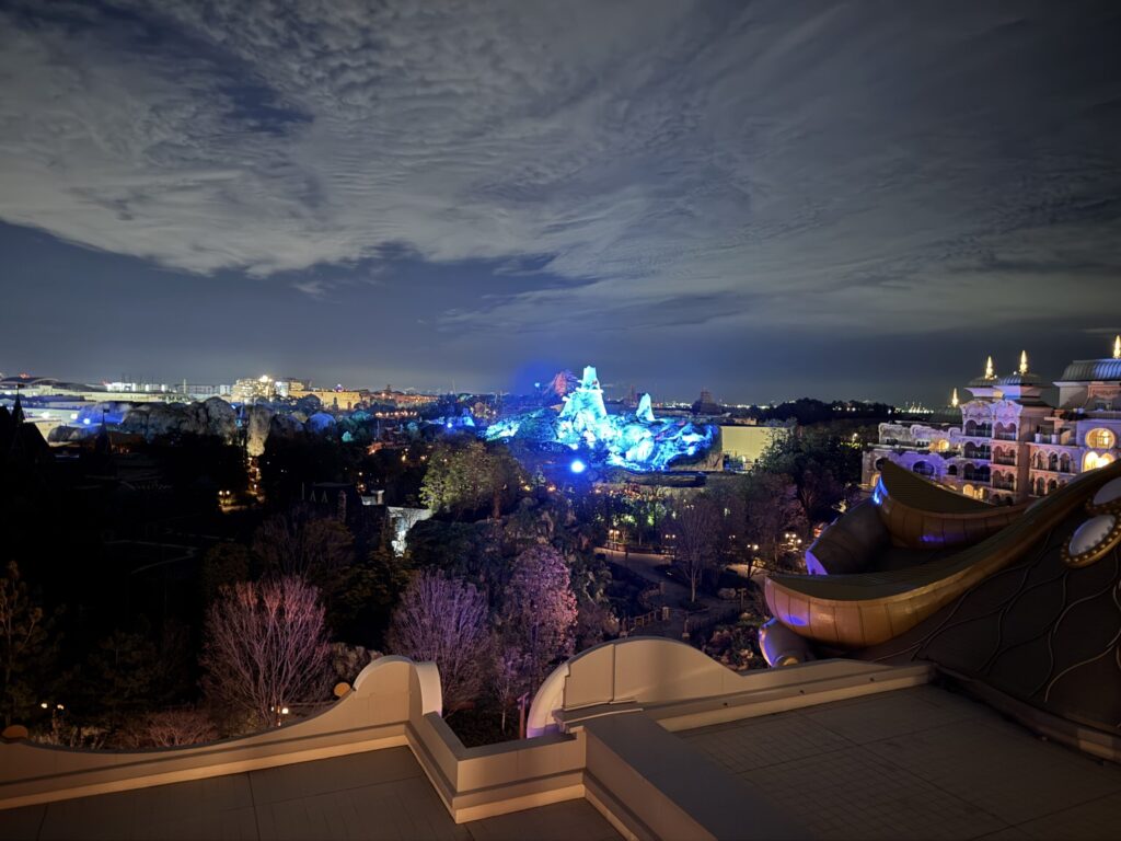 光ってるのは「ピーターパンのネバーランドアドベンチャー」の山です。