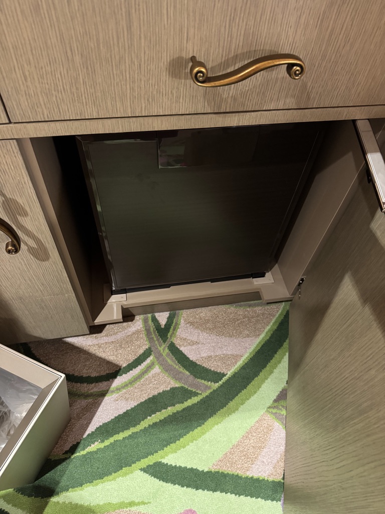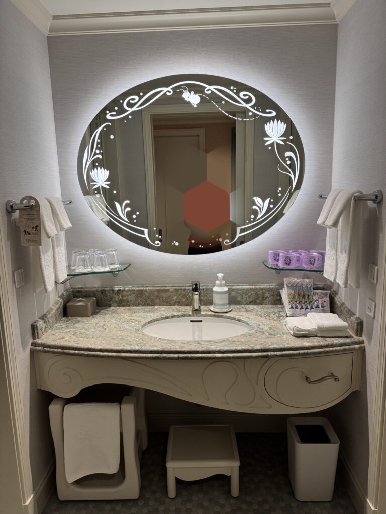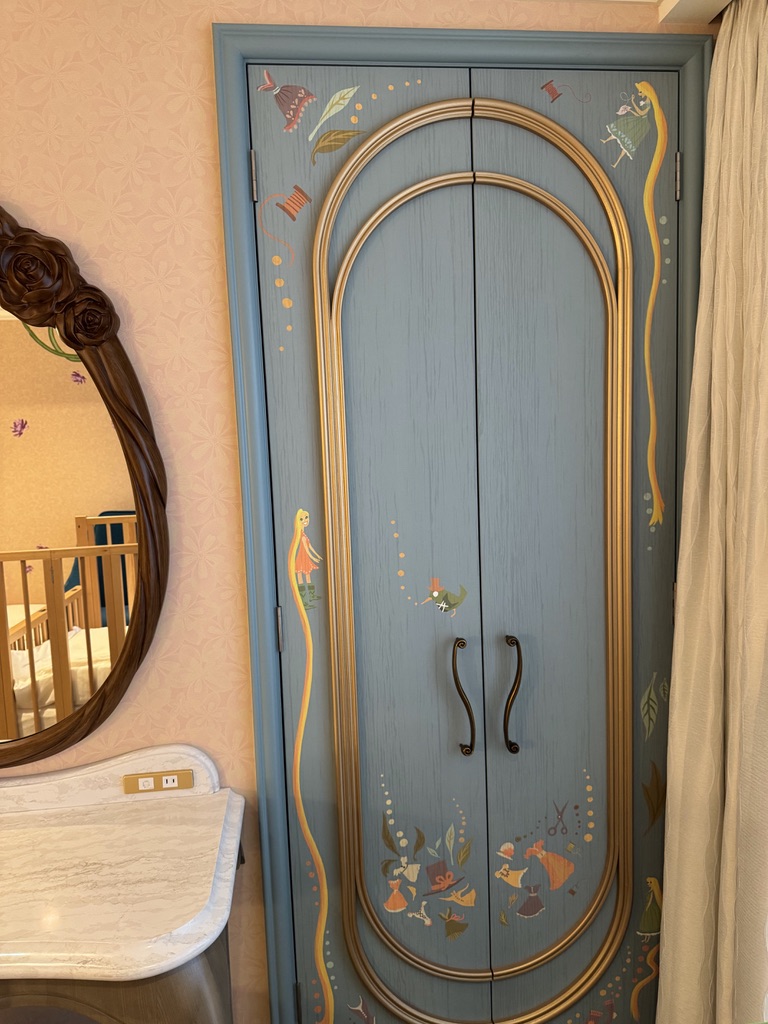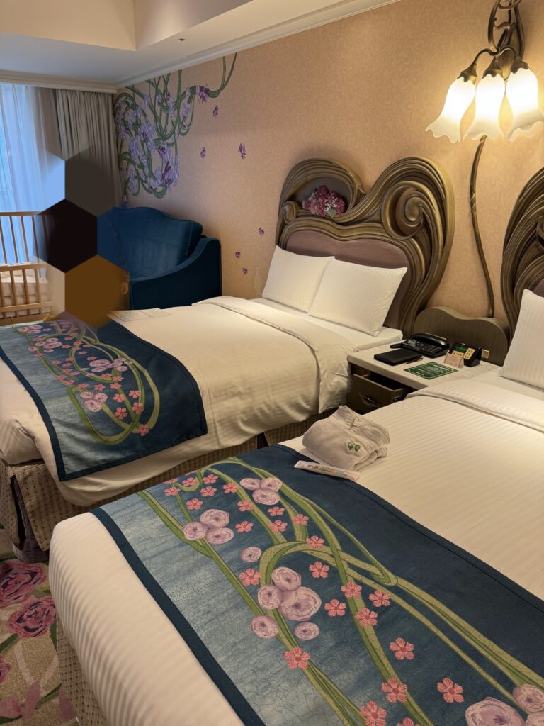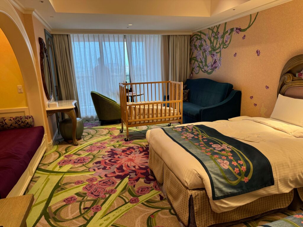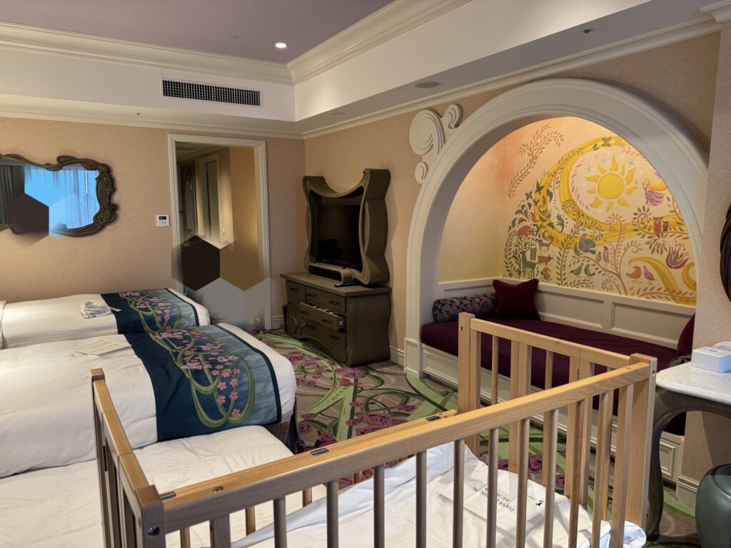 レギュラーベッド2台と引き出し式のトランドルベッド1台、壁のくぼみを使用したアルコーヴベッド1台のほか、クルーズベッド1台があり、ファンタジースプリングスが正面に見える客室で、今回7320号室にアサインしていただきました。