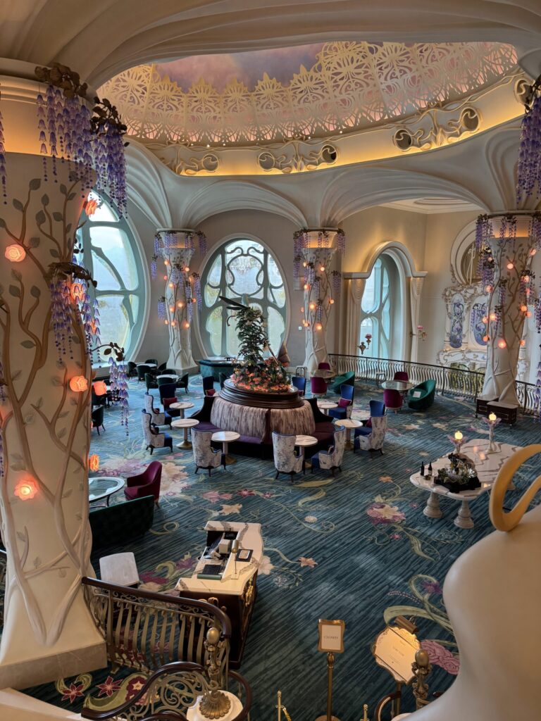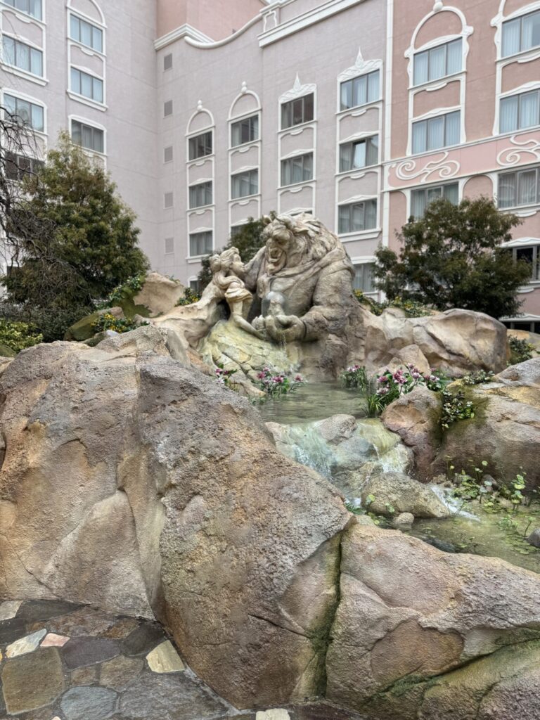 ファンタジースプリングスホテルにはロビーがある3階に「ローズコート」というディズニー映画『美女と野獣』のキャラクターが岩で表現された魔法の泉がある中庭があるので時間がある方は行ってみてください。