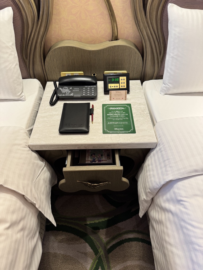 ベッドとベッドの間には電話、時計、メモがありその下の引き出しには持ち帰れるポストカードがありました。