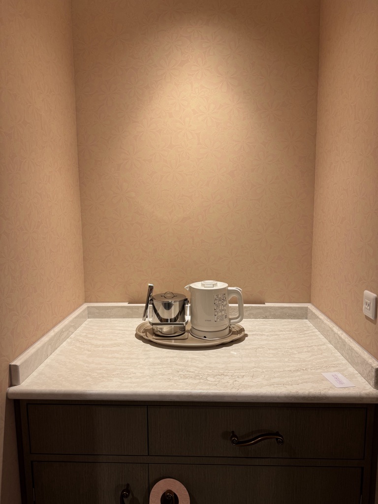 そして左のトイレの隣には棚があり電気ケトルアイスペールがありました。