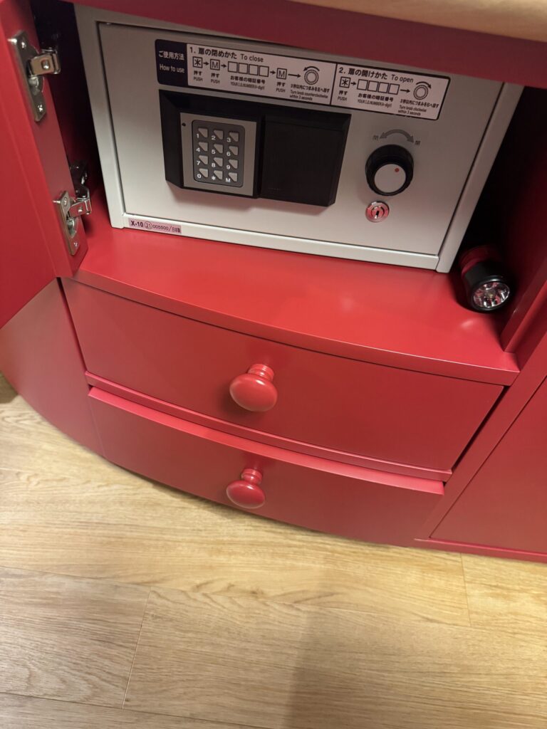 テレビ台の下の戸棚にはセーフティーボックスがあり、