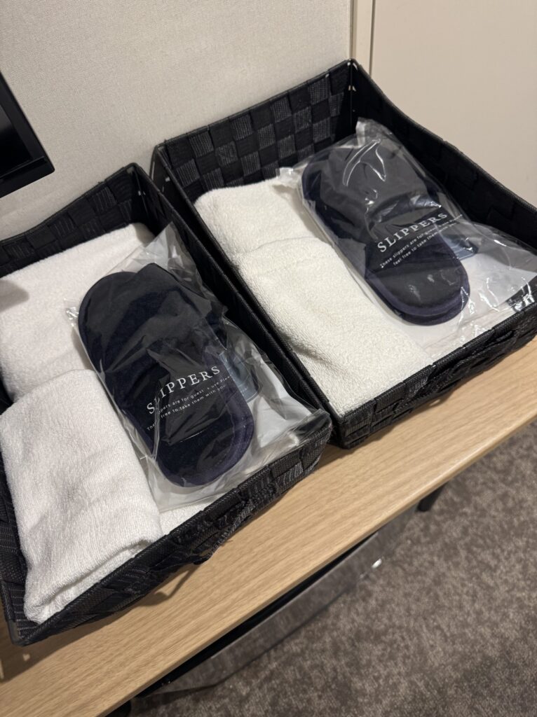 机の上にはスリッパとタオルとナイトウエアが入ったカゴも。