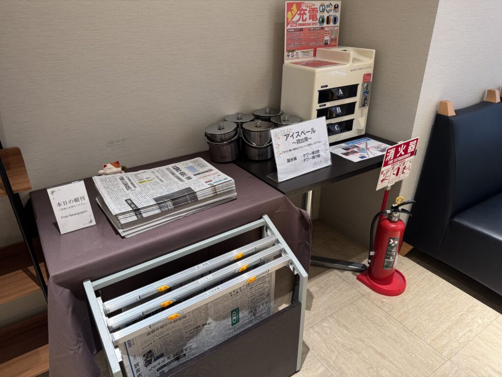 ロビーには新聞も置いてくれており、その隣にはアイスペールも置いてくれているのでアイスペールを利用する方はロビーで借りてから、お部屋に行ってくださいね。
