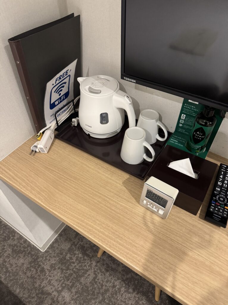 机の周りにコンセントが無いので入ってすぐ左の壁にコンセントがあり、そこから机まで延長コードを伸ばして、電気ケトルを使うことにしたのですが、少しそれが不便でした。