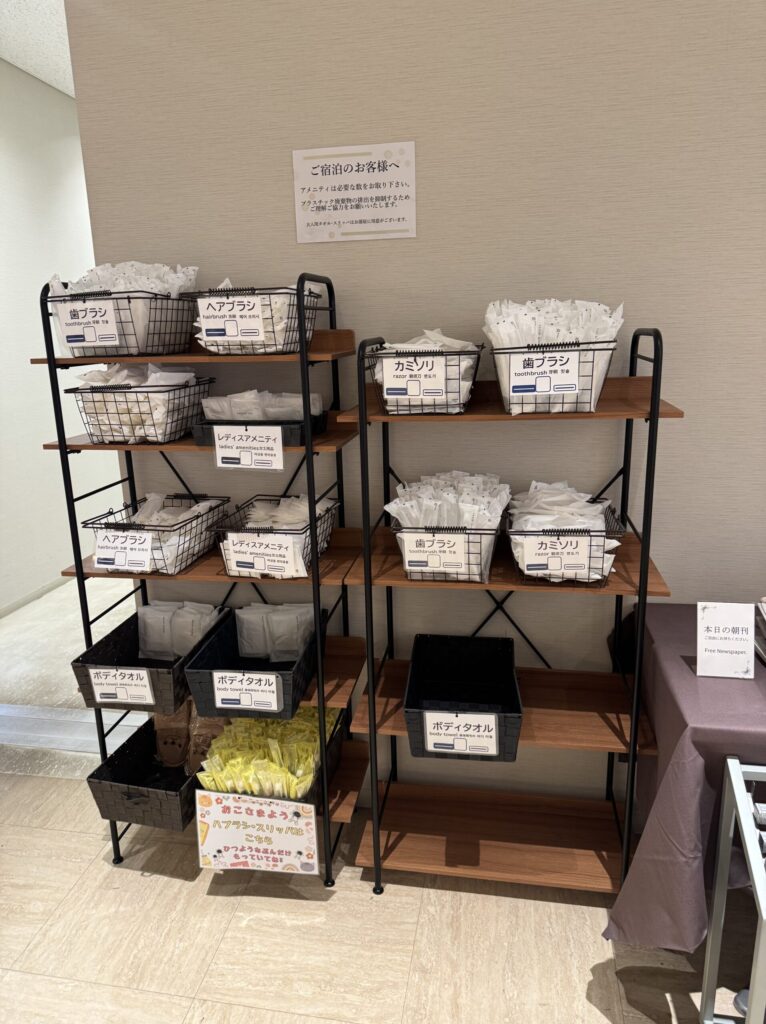 アメニティはロビーに置いてあるのでセルフで必要なものだけ取ることができます。