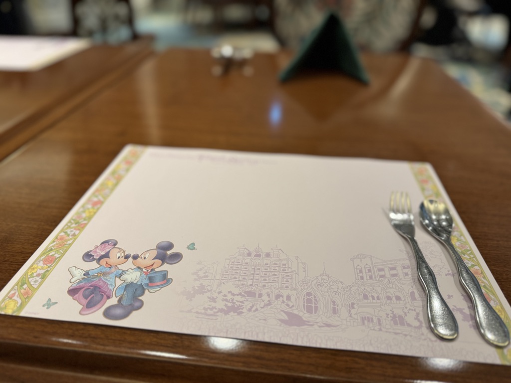 席につくと、キャストさんが子供用のフォークとスプーンとランチョンマットを準備してくれました。