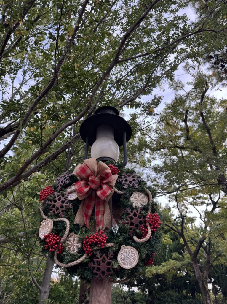 ワールドバザールに進むと大きなクリスマスツリーとリースが。
